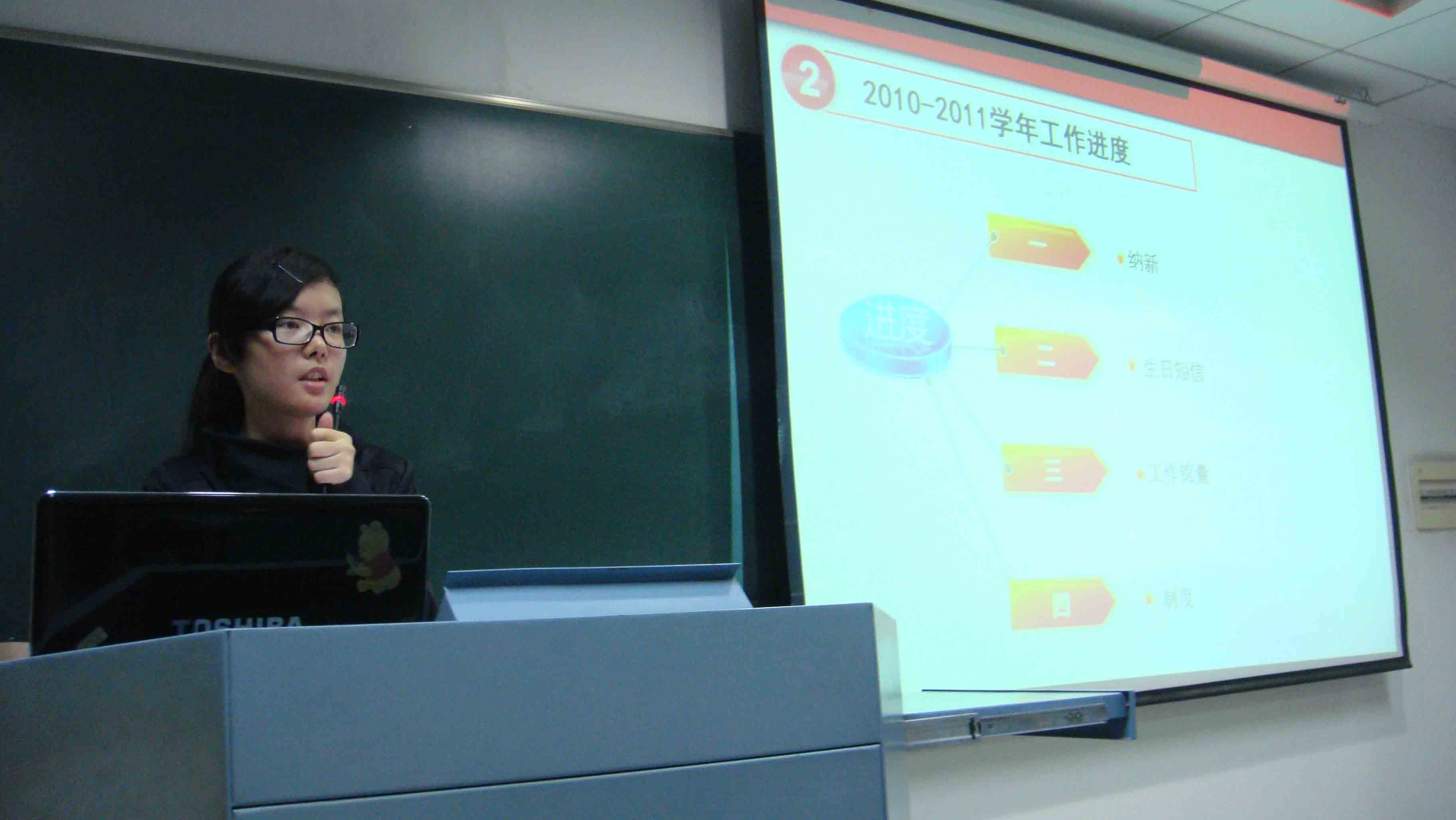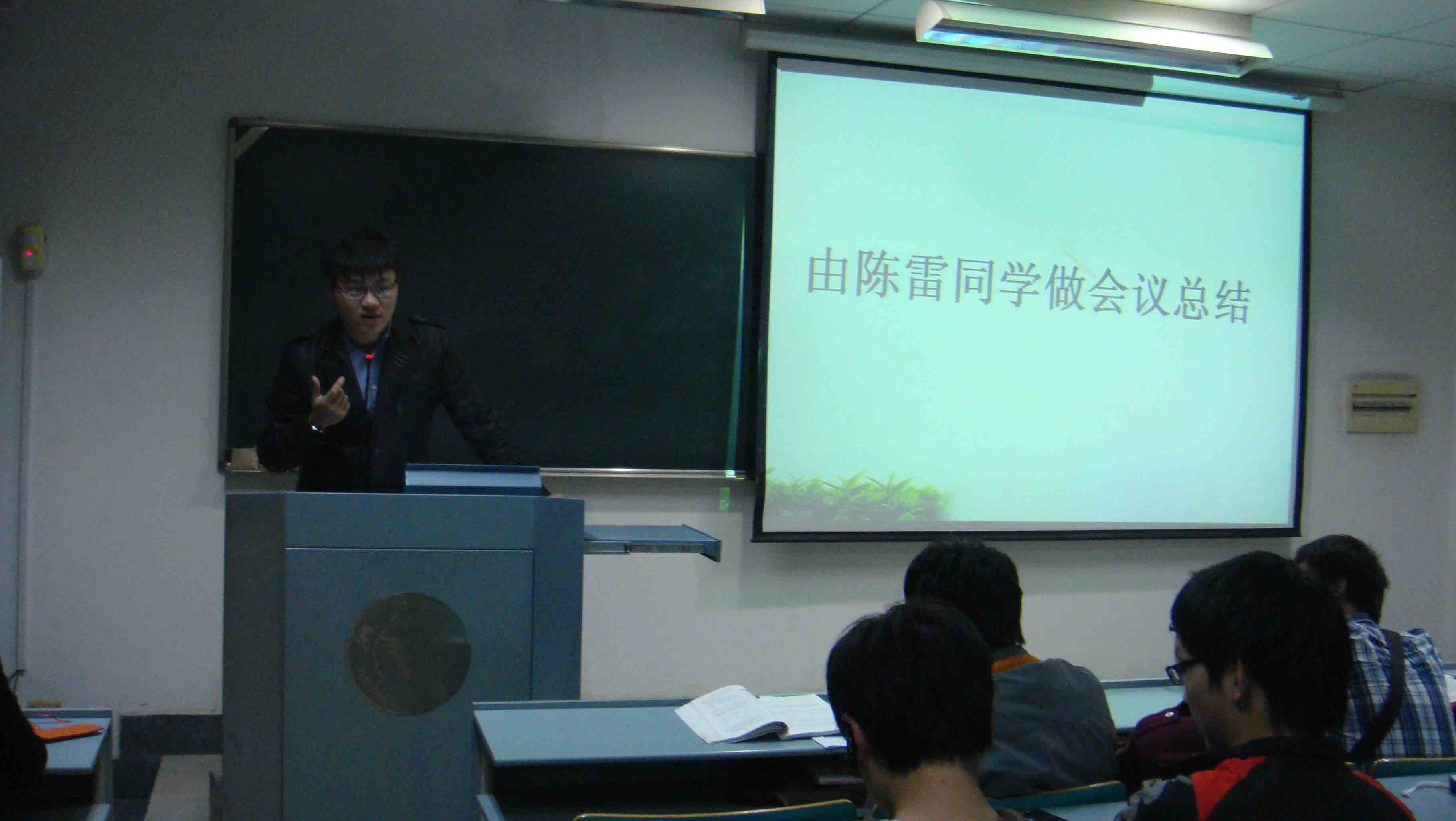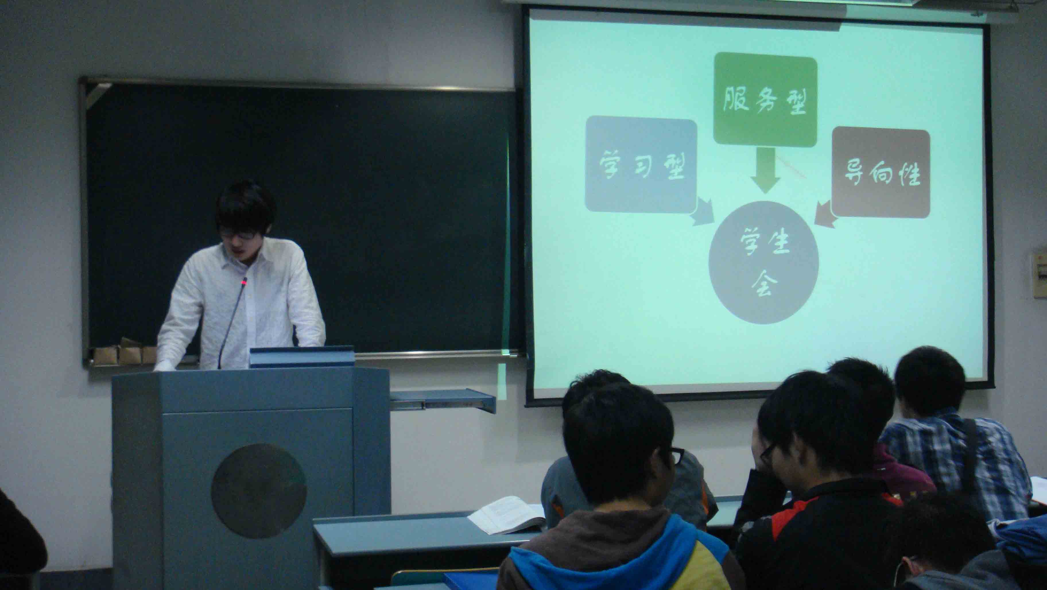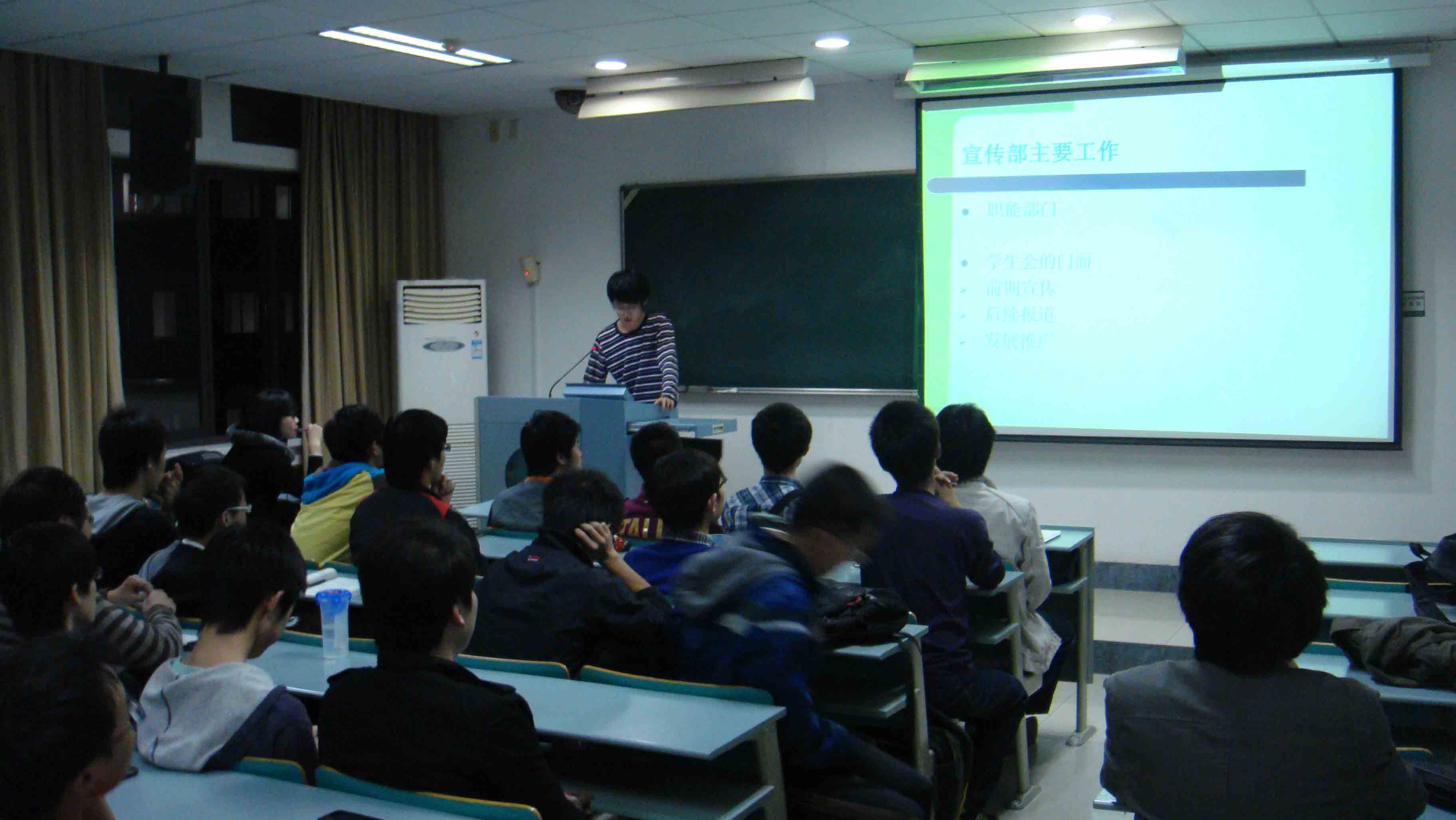 首先五部门部长分别作了主题报告,总结了过去一年中所举办的各项活动经验,指出了活动中的不足之处,并提出自己在新的一年中的计划与安排。其中由出席团成员阎文舟代替宣传部长王一翔做了宣传部总结,主席团成员魏谦笑代替宣传部部长孟浩权做了体育部总结。