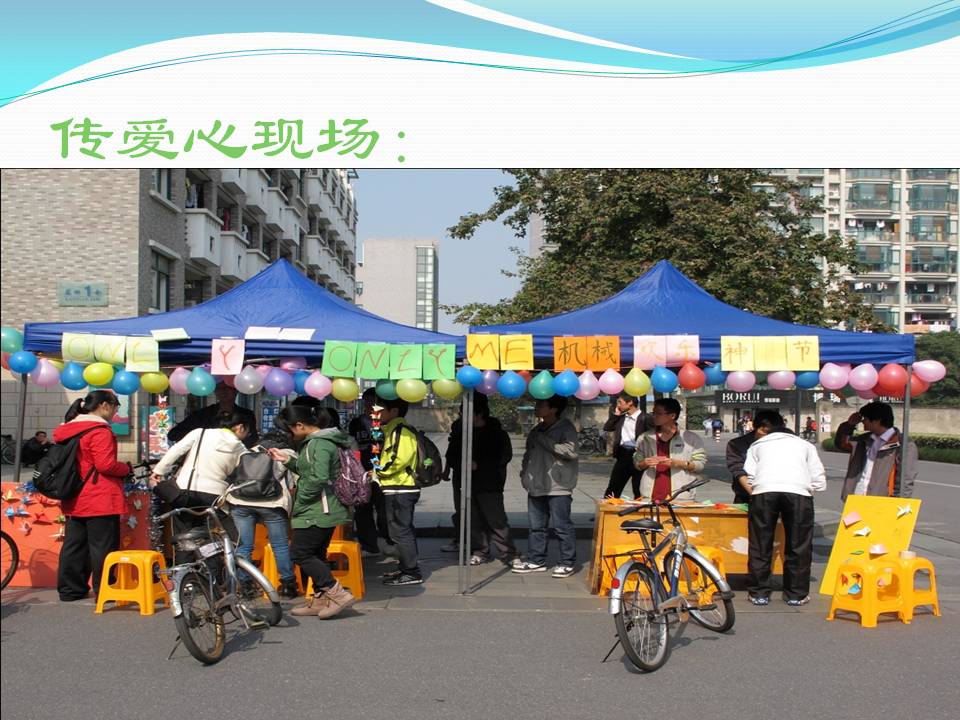 11日上午11时许,机械系学生会成员已在蓝田门口布置好场地。两位主席团成员也亲自来到蓝田门口助阵,全场瞬间被Hold住,五颜六色的气球和活动标牌引人注目。