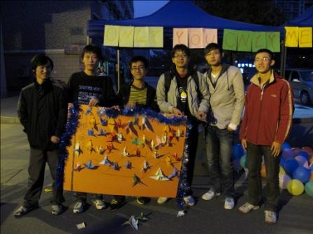 现场路过的同学积极参与到了我们的活动中,他们在纸上写好自己的心愿,并在机械系学生会干事的帮助下,将其折叠成千纸鹤粘贴在展板上,并收到精美的礼物作为纪念。同时他们可以领走自己感兴趣的已有心愿,在工作人员的建议下,他们帮助别人去实现这些愿望。最后他们将姓名和联系方式投入抽奖箱,活动最后抽出两名幸运同学获得了神棍节大礼——双截棍。随着夜色的降临,我们的活动也落下了帷幕,干事们进行了合影留念。