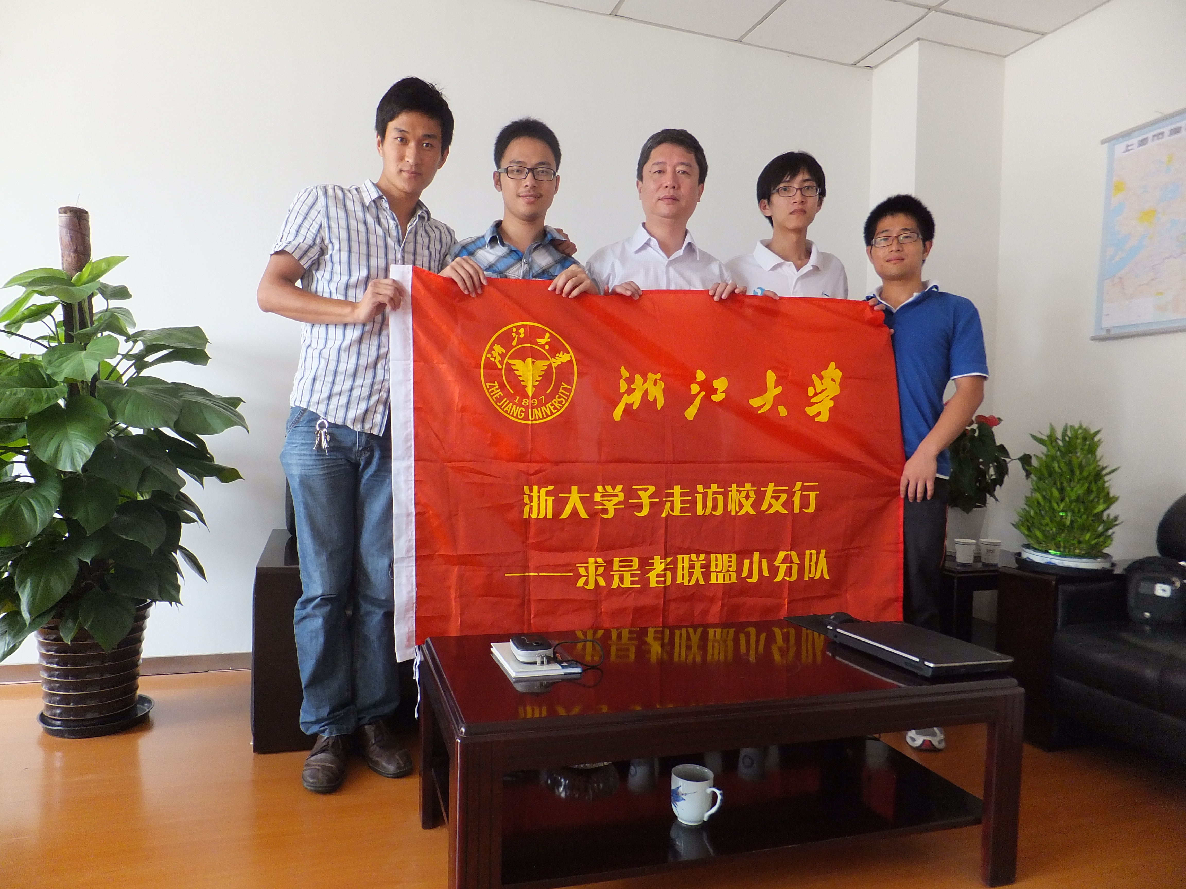 访谈结束后,我们与王学长进行了合影,并向王学长赠送了我们准备好的浙大纪念品。