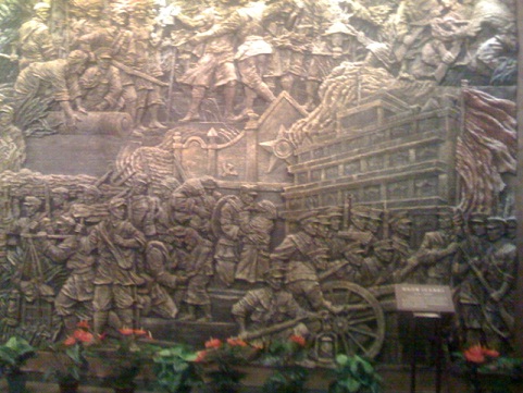 大门好似紫禁城的赭色城门,可能大小上略小一些。进门之后便是红船的雕塑,弧形的墙上更是凿有两层浮雕。我是见过真的红船的,但是感觉在墙边雕上这样一艘不完整的石头材质的模型船,似乎来得更加不简单。