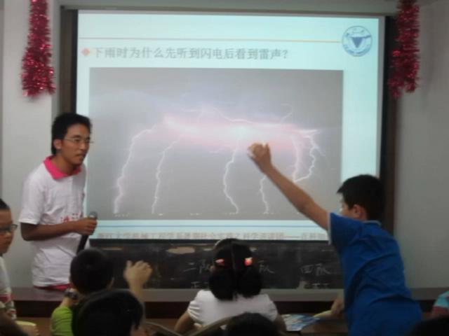 主持人韩冬同学以介绍三国杀中诸葛亮的技能观星作为开场白,一下子吸引了小朋友的注意,韩冬也鼓励大家积极思考,努力做个像诸葛亮那样上知天文下知地理的人。陈集东同学一开始出了一题“下雨时为什么先看到闪电后听到雷声”,好几个小朋友都举手回答,但多数只知道闪电和雷声是同时出现,只有一个小朋友答出光的传播速度比声音快,并补充了光和声音具体的速度。我们对这个小朋友知道得如此详细感到有些惊讶,相信他平时课外一定学习了许多科学知识。