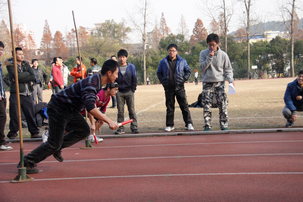 为推动浙江大学机械系体育运动的发展,让我们更近距离地接触校园、认识校园,同时促进体育运动技术的提高,丰富同学们的课余体育生活,加强班级之间的友谊和交流,12月8日,机械系团学联以“机情冬日,携手共赢”为口号,举办了“五行杯”体育联合竞赛之15*50接力跑比赛。经过各班的激烈角逐,最终机自1003班以1分40秒31问鼎冠军,机电0902班以1分45秒06勇夺第二,机电1002和工业工程0901/机电1001联队以1分45秒35并列第三,机自1002以1分45秒65争得第四名。