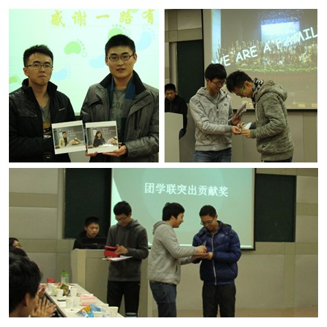 感恩会总共分为四个环节,有新人们对老人、老师们的感恩,也有老人、老师们对新人们的感谢。首先,每个部门的部长给各自部门颁发了部门的部门之星及杰出贡献奖,并根据其在过去一年的表现做了简短的评述。之后,现场播放了之前收集、整理、剪辑近一个月的新人们拍给老人的祝福视频,老人们的照片墙的等等,给现场带来了浓郁的感恩气息。接下来,胡子昂主席代表团学联给老师们赠送了感恩纪念相框,老师们的照片承载着团学联送上的祝福文字,代表着团学联对老师的祝福。最后,主持人将各部门写满了新年祝福的明信片转交给了各部门的老人们,这代表着大家对每一个老人辛勤付出的感谢。整个过程,有辞旧迎新的喜悦,有打趣恶搞的幽默,也有怀念回忆的感动。