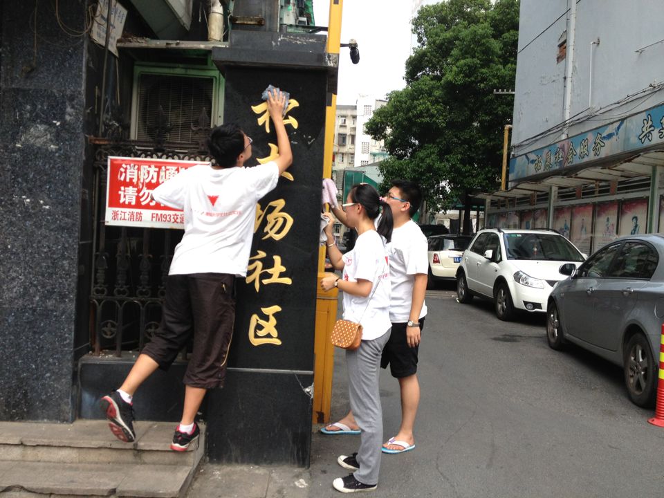 下午队员们来到社区后,社区的张静姐姐向队员们发布了最新任务,把社区内的有松木场社区字样的宣传窗擦拭一遍,并准备好了抹布和脸盆。那天正好是艳阳高照,宣传窗又都是在太阳底下的,因此这项工作意味着他们得在太阳底下工作几小时,不少队员都产生了不良情绪,但在队长和一个学妹首先开始工作后,大家也都想开了,反正一定要做的,那就早点做好,早点休息。大家一人拿着一块毛巾就风风火火的干了起来。太阳底下干活确实很难受,就像在火炉中一样,都是汗如雨下,但大家都抱着一股气,既然别人能做,自己为什么不能。在擦拭期间,大家充分运用身高差,高个子擦拭宣传窗上部,不高的擦拭宣传窗下部和中部,提高了效率,但是也遇上一些难题,比如就是窗上有些以前贴的胶带纸,不得不说,这真是太难了,透明胶还好,双面胶那叫一个难,使半天劲也很难去除,最后实在不行了就去向社区借了半瓶酒精,这才使工作变得轻松。