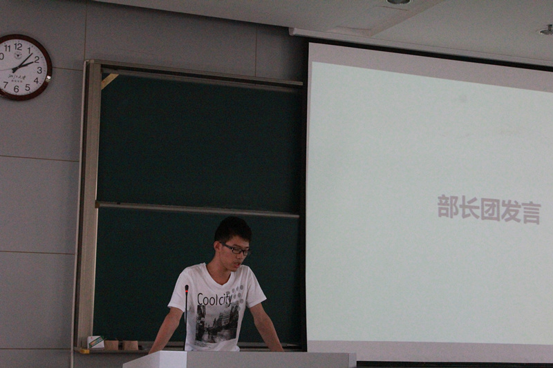 会议的下一项议程是各部门部长发言。外联部部长李盛茂、实践部部长金涛、宣传部副部长鲍建军、办公室部长王禅童、文体部副部长李泽诚以及学术部副部长邱桐分别根据部门的工作介绍、内部建设和未来展望做出激情洋溢的演讲,博得大家的阵阵掌声。
