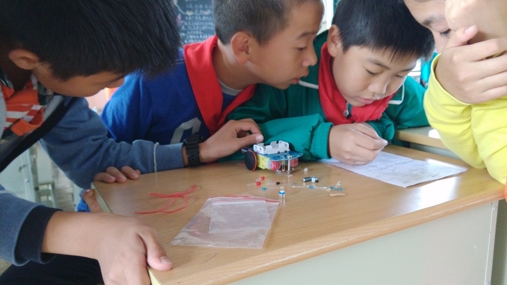 在装配“小车”的过程中,志愿者和孩子们也遇到了一些意想不到的问题。在准备焊接电路元件的时候,志愿者发现自身所带的工具不够用,这时候一名热情的小朋友主动带领志愿者到学校的器材室借用了电焊比及锡焊丝等物品。孩子们的主动帮助让志愿者们非常感动,让志愿者们觉得自己正在做的志愿者活动是有意义的。