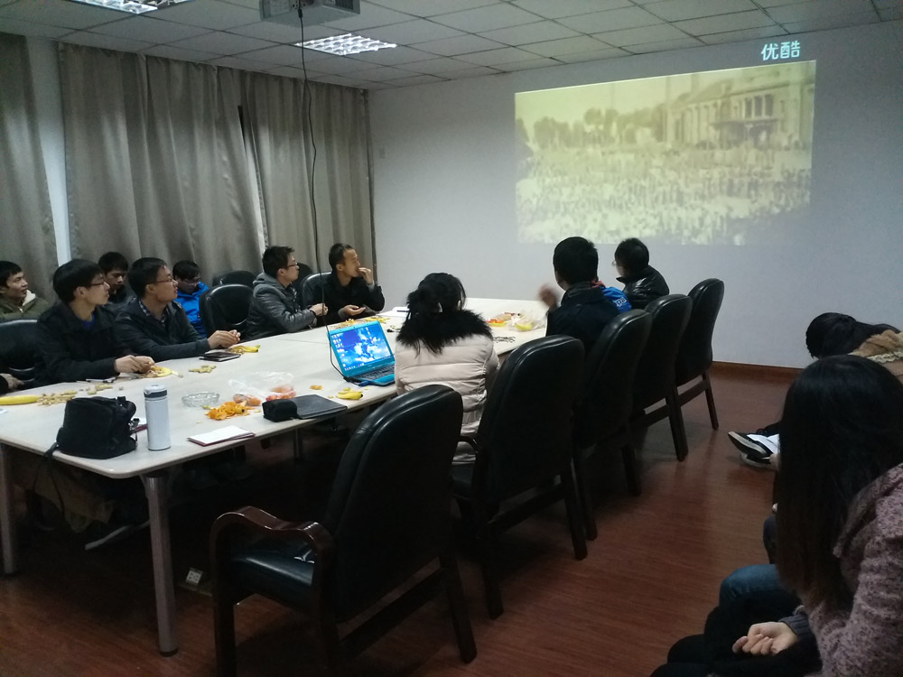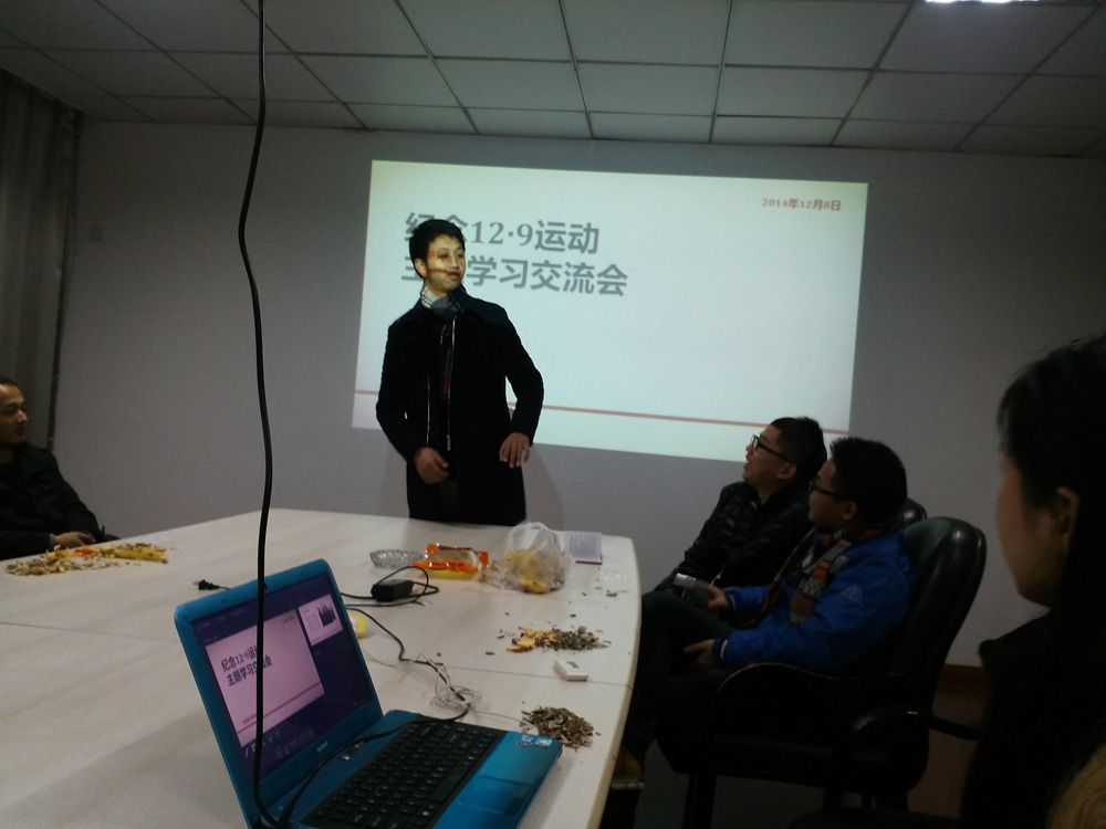 2014年12月8日,晚上8:00,我院机械电子研究生1402班团支部为纪念一二九运动,学习历史事件而组织了交流茶话会活动,活动在液压新楼三楼会议室进行,交流会持续到晚上22:00。大家在12月9日来临之前,对一二九运动有了明确的学习与认识。