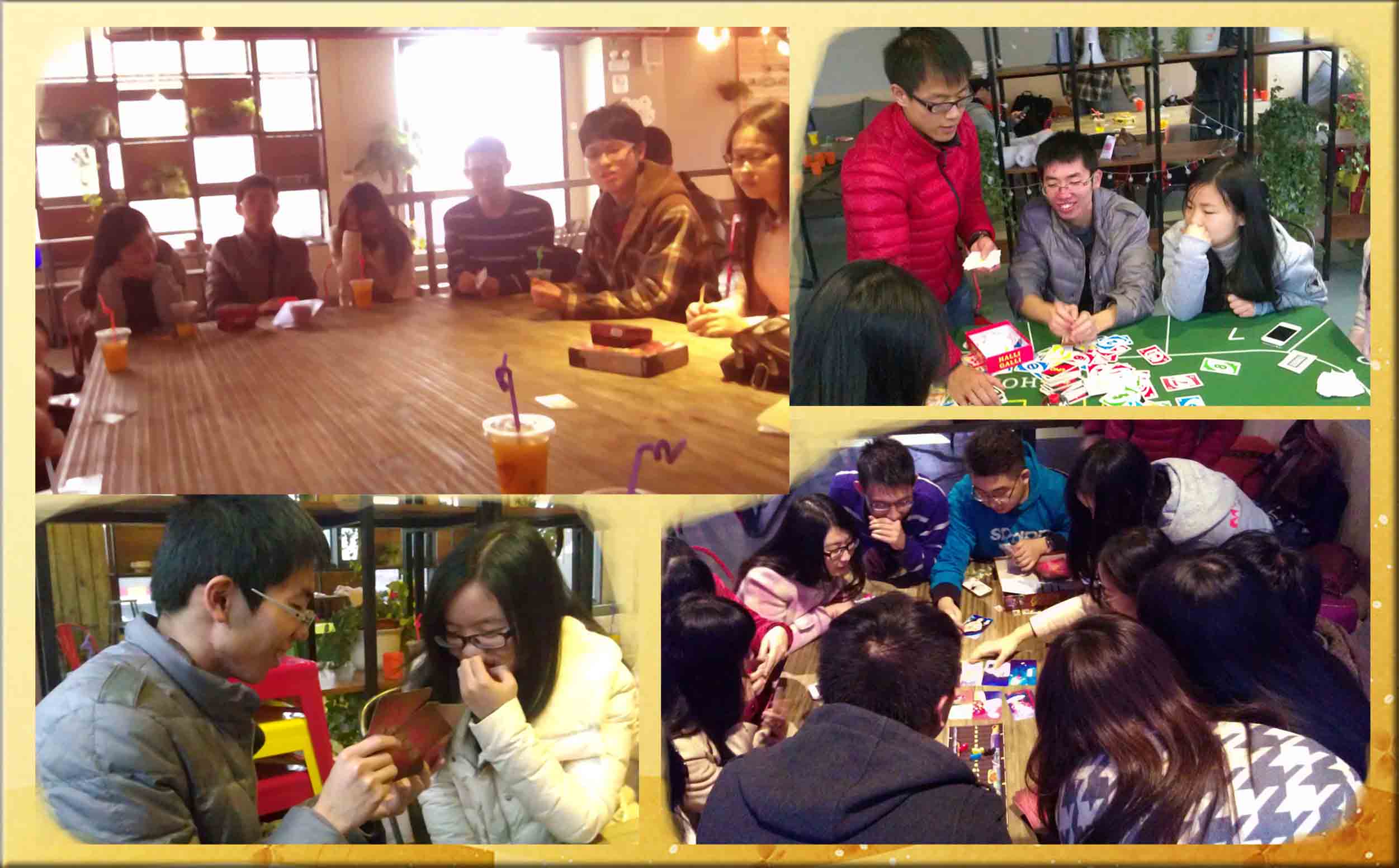 下午13:30分,我们班的男生与汉语言文学专业的女生们分别先后来到火星工厂,也就是在我们相约的第一站,相遇,想识。在火星工厂,两个专业的孩子们在进行了简单自我介绍以及更进一步的相互交流了解之后,一堆堆的桌游就迅速上线了。大家一起玩UNO,一起“只言片语”。正所谓,“男女搭档,干活不累”,在几个小游戏间的彼此交流之下,大家迅速地融在了一起。一起收获成功的喜悦,一起感叹时运的不济,一起感受“人生”的跌宕起伏。更重要的是,在其间感受到了彼此间活火热的心!