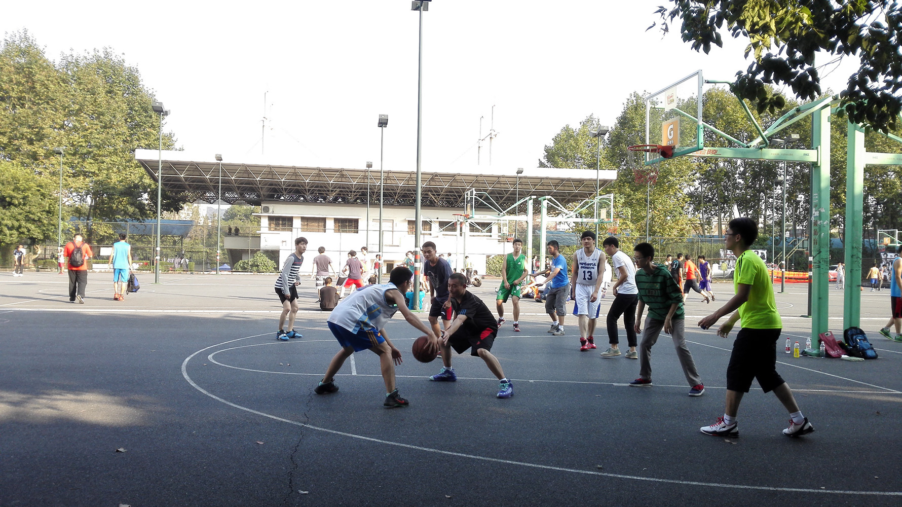 比赛开始,提起篮球赛赛事就兴奋的潘同学开始吹响了裁判的哨子。哨声一响,两队篮球赛队员立马提高了警惕,现场开始有了紧张的气氛。虽然队伍是自发组织的,但是篮球是兄弟间的桥梁,从场上的情况来看,大家配合的十分默契,彼此间一个眼神一个动作,对方就立马会意。由于实力相当,两队你攻我守,场上的比分一直持平,大有不分胜负的趋势。