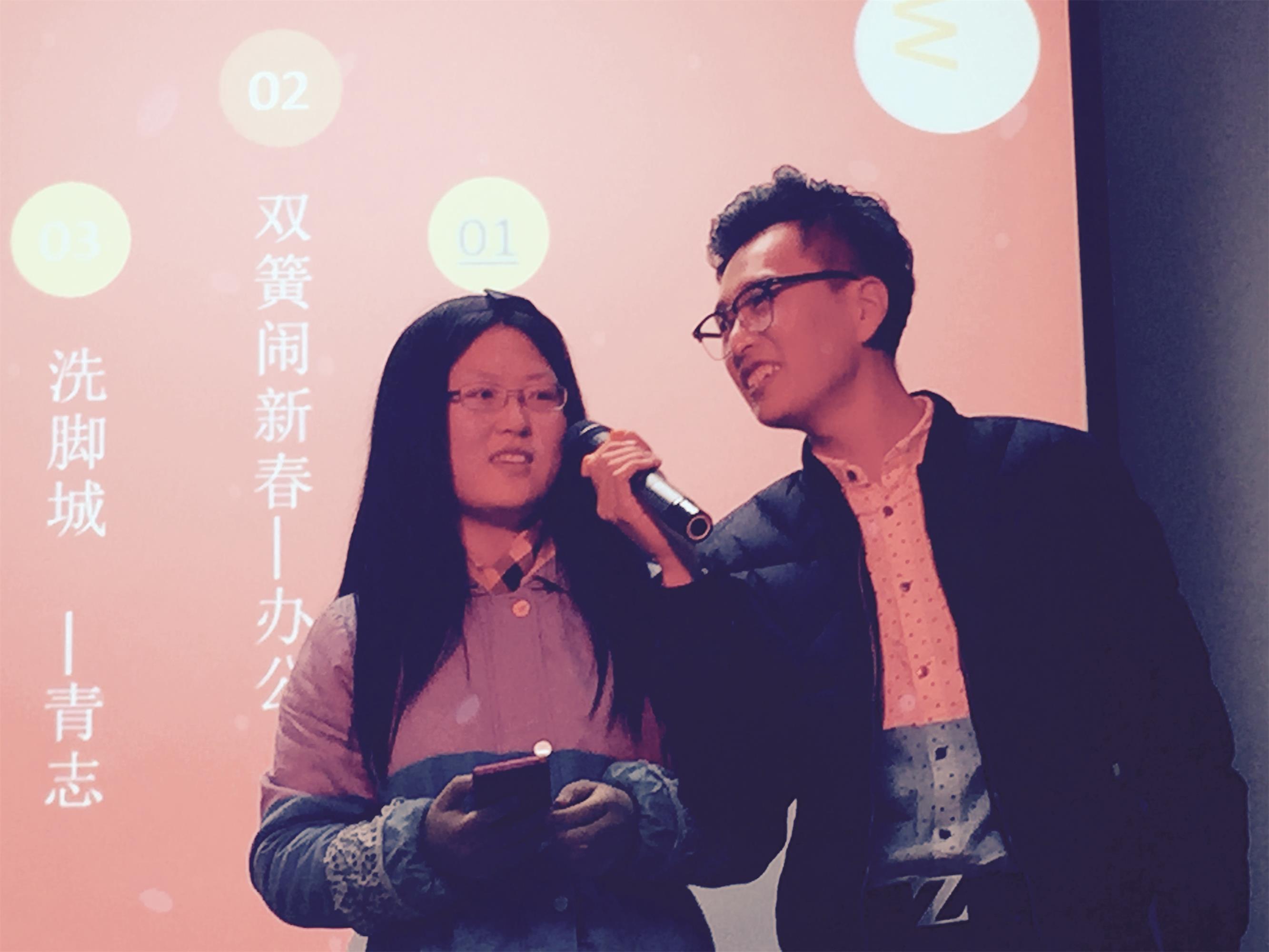外联部带来的“炫光舞”和“愿天下有情人终成眷属”的祝福,让大家暖意十足;青志部表演的“选秀风波”逗乐了全场的观众;办公室的“双簧闹新春”同样韵味十足;而文体部带来的“文体达人秀”舞蹈,更有乐队演奏;最后宣传部带来集体舞蹈“纤夫的爱”,之后又再次风格突转,用一首“因为爱情”深情压轴。