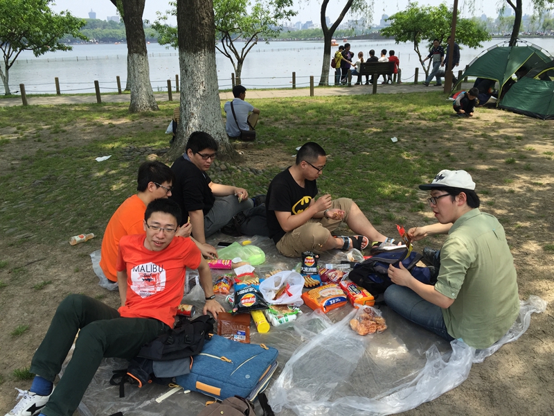 本次五一参观之游,还有一个重要的目的就是帮助同学们放松心情,调整状态,欣赏五月杭城的美景,感受谧静西湖的惬意。到中午时分,大家来到了西湖旁的草坪上进行野餐,在沐浴和蔼阳光的同时,分享着大家所带来的零食和水果。