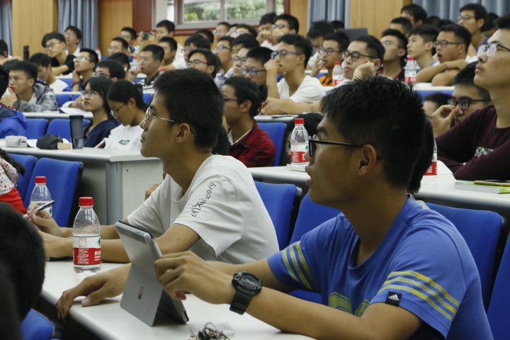 随后,报告会正式开始。杨院士由浅入深地为学生们讲解机械学科发展概况。首先从师资队伍,本科生教育与研究生教育介绍学院概况,其次从科研成果、学科竞赛、对外交流的角度介绍机械学科,以产学研结合成果讲解学科的产业落地情况。杨院士着重讲解了学院机器人方向的发展现状以及取得成果,杨院士使用日常生活中的情形举例,来为同学们讲解机器人的优点与应用,并通过与其他学校发展状况的对比让同学们对浙大机械在全国乃至全世界范围内的学科地位有了比较清晰的认识。杨院士在讲解过程中结合两弹一星研究、我国的航天计划、各种大国重器,将互联网时代新机械发展的特点及智能装备与机器人技术前沿清晰地展现给在座每一位同学。讲到精彩之处,现场不时响起热烈的掌声。
