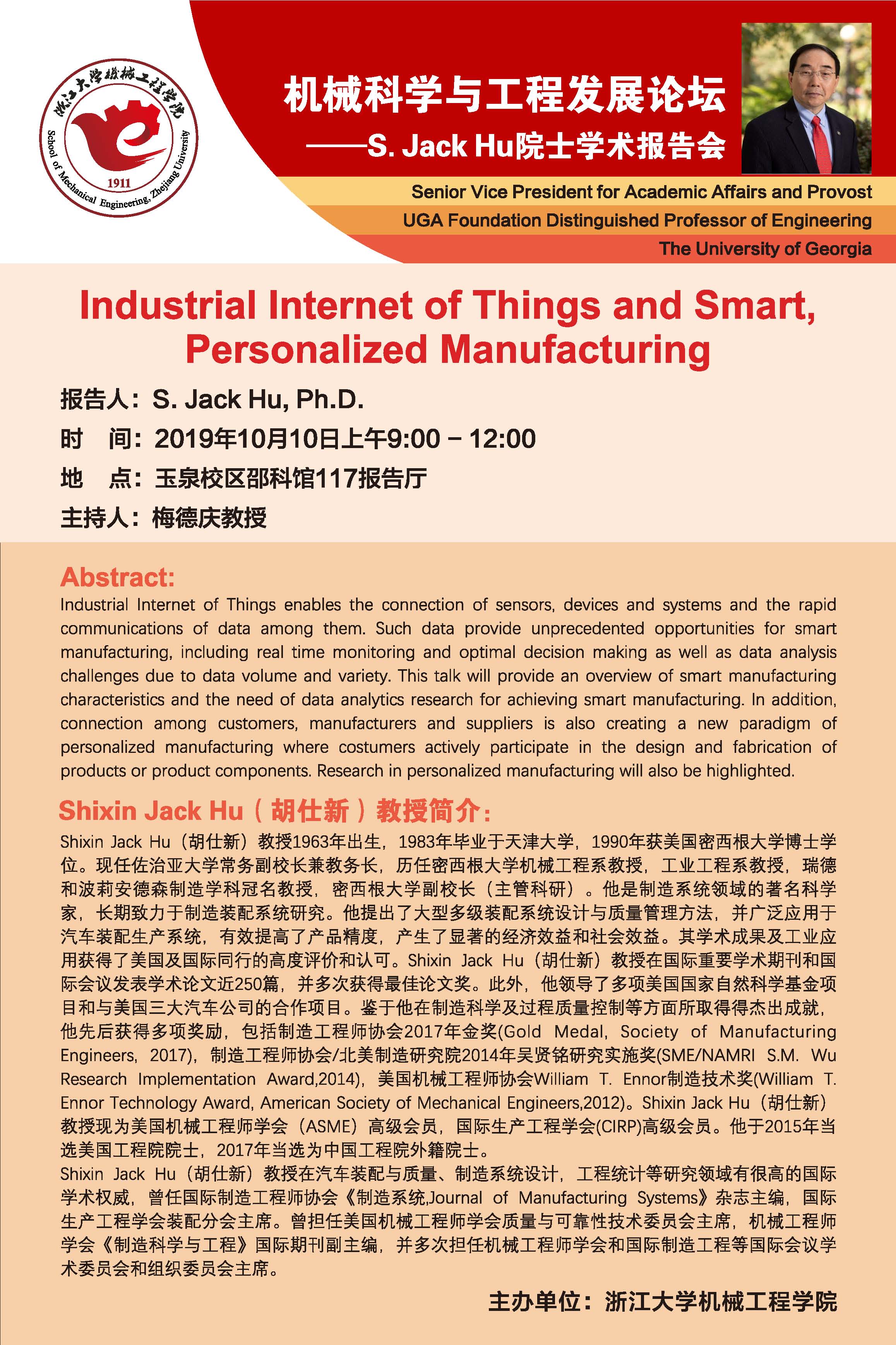 关于佐治亚大学S. Jack Hu院士学术报告会的通知