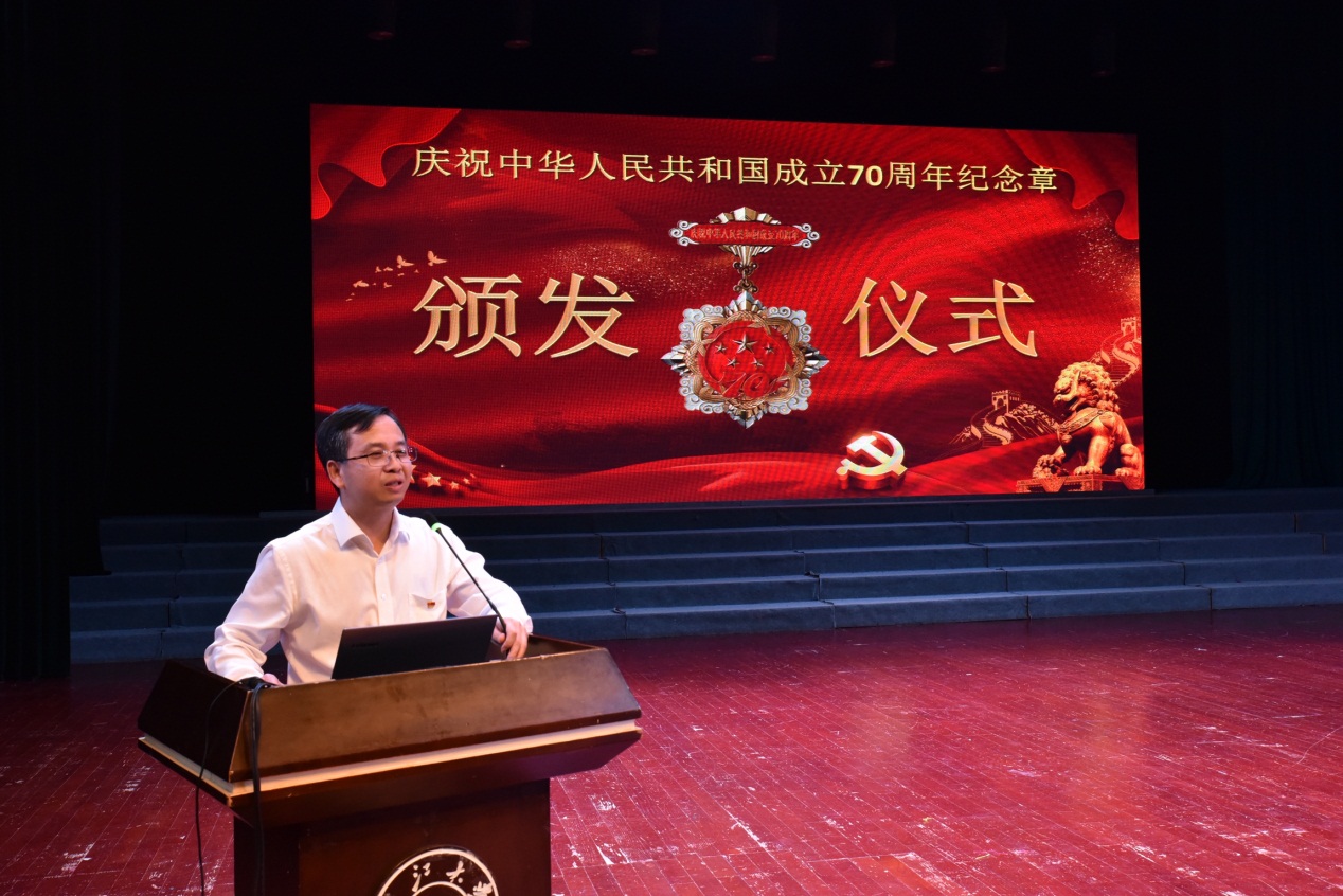 梅德庆书记为11名教师颁发纪念章,代表学校对获得纪念章的11位老师表示热烈祝贺,对他们长期以来为学院发展特别是在教学科研方面做出的卓越贡献表示衷心的感谢,并号召学院广大师生向他们学习。荣获纪念章的教师代表发表感言,表达对祖国70周年华诞的热烈祝贺,同时希望老师同学们能够砥砺前行、奋勇拼搏,为学院的发展建设再创辉煌!