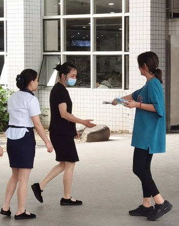 下午的文化广场天气炎热,支部同志们分散在食堂前、超市里、广场上,主动为路过的老师和同学们送上《垃圾分类指导手册》等资料,热情讲解垃圾分类等环保知识,为环保宣传尽心尽力。