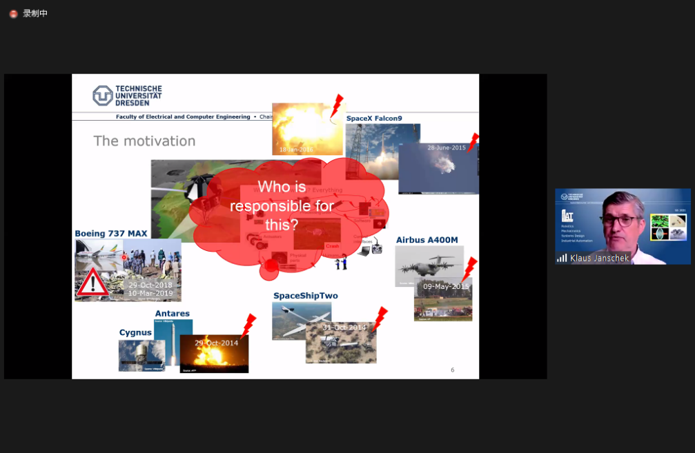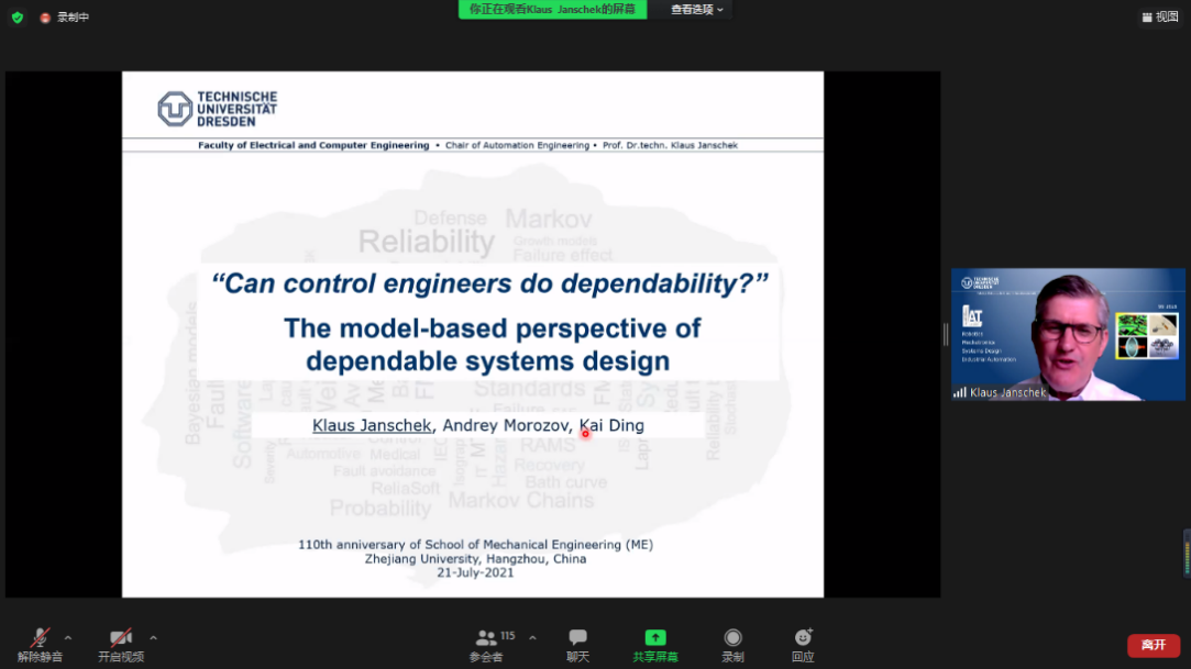2021年7月21日,应浙江大学机械工程学院邀请,德国德累斯顿工业大学Klaus Janschek教授为我院师生举行了一场题为“Can control engineers do dependability? The model-based perspective of dependable systems design”的线上学术报告会,讲座由我院朱笑丛副教授主持,学院130名师生线上参加。