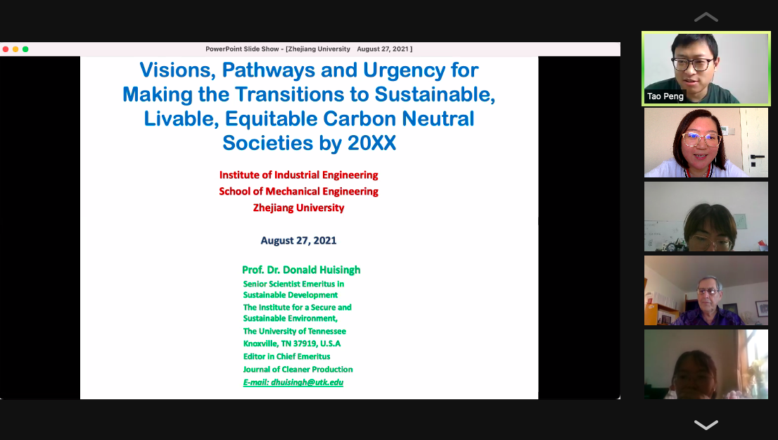 2021年8月27日,应浙江大学机械工程学院邀请,美国田纳西大学Prof. Donald Huisingh为我院师生举行了一场线上学术报告会,主题为“Visions,Pathways and Urgency for Making the Transitions to Sustainable,Livable,Equitable,Carbon Neutral Societies by 20××?”。报告会由我院彭涛副教授主持,学院百余名师生线上参会。