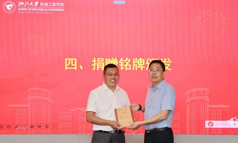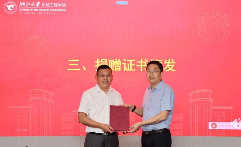 丁海忠与蔡茂生代表双方签署捐赠协议。随后,丁海忠向蔡茂生颁发捐赠证书和捐赠铭牌。单建军、叶新芳、方景春、陈光浦、蔡文蕊等共同见证。