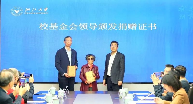丁海忠代表浙江大学教育基金会向张光琼教授,沈波、章国巨两位校友颁发捐赠证书,向张光琼教授和章国巨校友颁发铭牌。