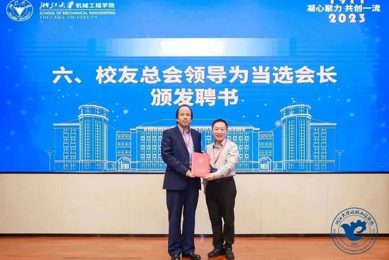 大会审议通过了机械工程学院校友分会章程(修订)和校友分会第三届理事会建议名单。全国政协常委、中国工程院院士、浙江大学工学部主任杨华勇当选机械工程学院校友分会会长。校友总会常务副秘书长黄任群为杨华勇院士颁发聘书。
