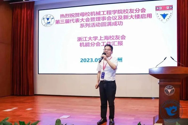 各地校友分会分别介绍了近年来工作开展情况,北京校友会机械分会会长潘晓峰表示近年来,学院无论是科研攻关,还是潜心育人,各方面都取得了亮眼的成绩,自己作为校友备受激励,未来将带领北京校友会在校友联络、校地合作、学生就业创业等方面做出新的贡献。北京浙大校友会书记、浙江大学校友总会顾问、机械学院校友分会顾问潘里新作为学院开物论坛第一期的主讲人表示,希望浙大机械能够继续服务国家战略,为国铸重器,攻克“卡脖子”难题,为中华民族的伟大复兴做出更大贡献。衢州校友会机械分会会长邓小雷表示很高兴能够回母院参加这次的校友大会,他从服务地方经济、做好社会公益、树立校友品牌等方面汇报了近年来衢州校友会的发展情况,他表示,今后衢州校友会将重点在高端装备制造、企业技术能力创新等方面深耕发力。杭州校友会机械分会孙永祥表示学院近年来取得了突飞猛进的发展,自己作为机械学院的校友倍感自豪,未来将带领杭州校友会在加强与母院的沟通联络、服务地方校友、扩大影响力等方面不断努力。上海校友会机能分会会长李儒鹏介绍了分会成立的历史,他表示上海机能分会是个大家庭,未来将继续带领分会在紧密联系校友、办好孵化基地、服务校地合作等方面积极发挥力量,也衷心祝愿母校母院的发展蒸蒸日上,再创辉煌。