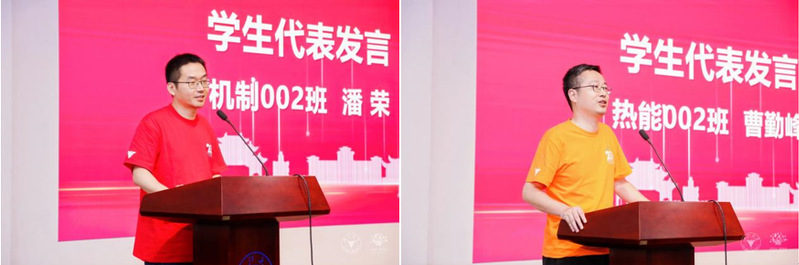在学生代表发言环节,机械2000级校友潘荣、能源系2000级校友曹勤峰分别上台发言。他们深情地回顾了在校期间的点点滴滴,表达了对母校和老师的感激之情,并分享了各自在工作岗位上的奋斗历程和人生感悟。