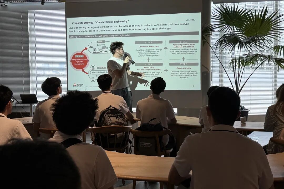 在三菱电机东京总部,交流团的同学们分成六组依次汇报了本次研学的阶段性成果,内容涵盖MELSOFT Gemini仿真、e-F@ctory价值闭环、人机协同与“精技术-全系统-新范式”战略构想等。各组汇报逻辑严谨、见解深入,获三菱负责人高度认可。