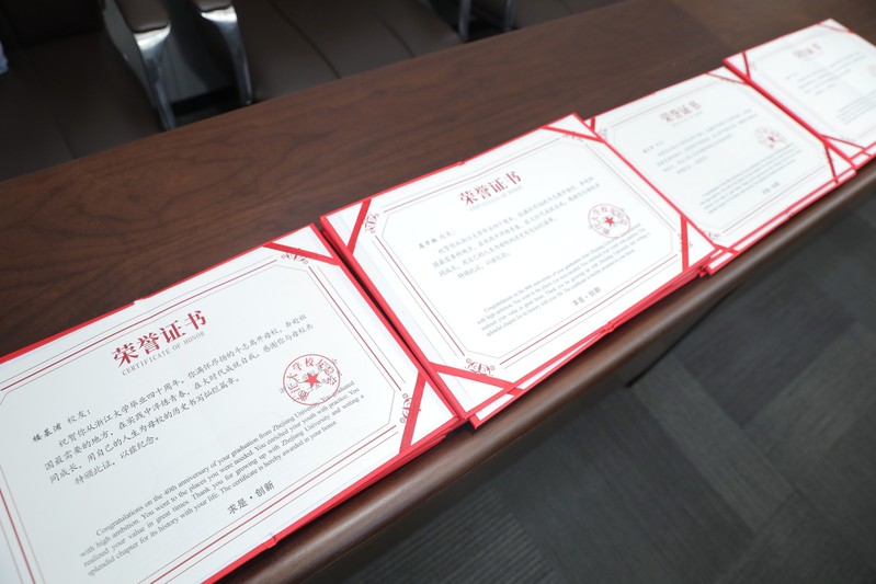随后,大家来到开物苑1幢208会议室。精心准备的返校礼物早已整齐地放在桌上,等待校友打开。校友们迫不及待地试穿红色院衫,别上校徽,现场洋溢着一片温馨与喜悦。紧接着,在热烈的鼓掌声中,王柏村副院长首先向校友们汇报了学院近年的发展情况与成果。介绍完毕后,学院举行了捐赠仪式,以感谢精密机械81级1班校友们向学院院友林项目的慷慨捐赠。张凯老师代表学院致辞,感谢校友们对学院发展的大力支持。王柏村副院长代表学院为校友们颁发捐赠荣誉证书,吴添羽校友作为代表上台领取。时逢毕业四十周年,学校也为于秩年返校的校友们定制了返校纪念证书。
