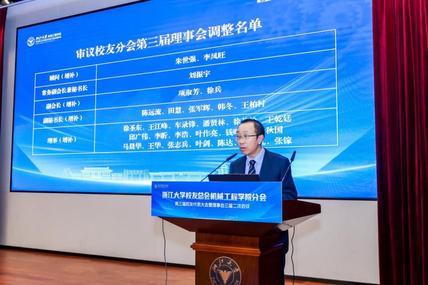 11月8日下午,浙江大学校友总会机械工程学院分会第三届校友代表大会暨理事会三届二次会议在紫金港校区开物苑报告厅举行。全国政协常委、中国工程院院士、浙江大学工学部主任杨华勇,浙江大学党委原常务副书记陈子辰,全国政协原常委、浙江大学原副校长冯培恩,浙江大学发展联络办副主任兼校友总会常务副秘书长吴维东,浙江大学校友总会原常务副秘书长杨达寿,苏州浙江大学校友会名誉会长张志华,杭州浙江大学校友会会长、浙大科发股权投资公司总裁、液压80级校友陈晓锋,浙江理工大学原副校长、精机80级校友陈文华,浙江大学机械工程学院原党委书记李伟,浙江力聚热能装备股份有限公司董事长、精机84级校友何俊南,杭州景业智能科技股份有限公司董事长、机制87级校友来建良,浙江图讯科技股份有限公司董事长、机设92级校友王斌,嘉兴大学校长、浙江大学机械工程学院教授、机制95级校友梅德庆等120余名理事及校友代表受邀出席,学院领导班子、各系所中心负责人及师生代表参加了大会。大会由学院党委书记刘振宇主持。