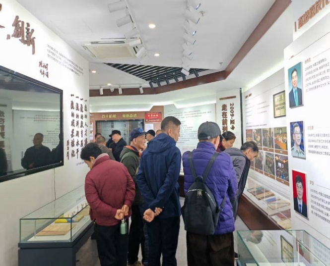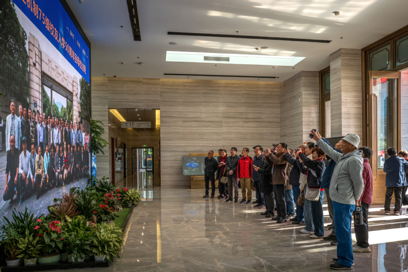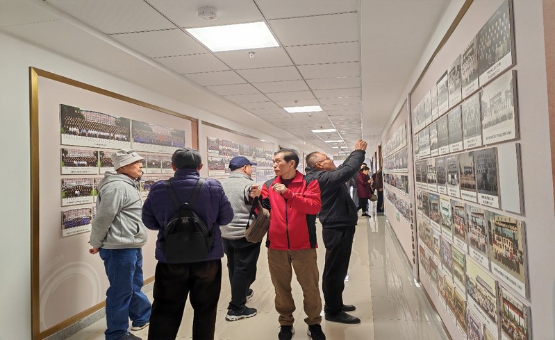 随后,校友们步行至开物苑1幢二楼校友长廊,历届学生的毕业照依次陈列,从黑白到彩色的影像变迁,不仅记录了岁月流转,也见证了母校的发展历程,引来校友们连连感叹。