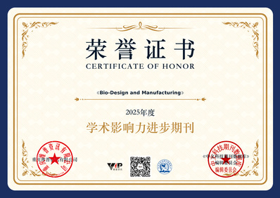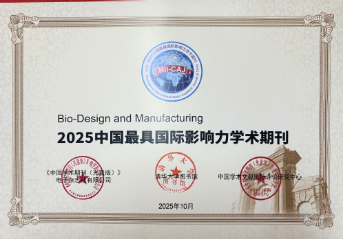 2、自2021年起,《生物设计与制造》英文期刊连续5年荣获中国知网颁发的“中国最具国际影响力学术期刊”