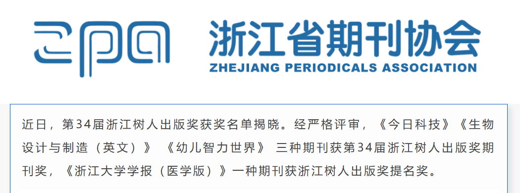 1、2025年12月,《生物设计与制造》英文期刊荣获荣获第34届浙江省树人出版奖