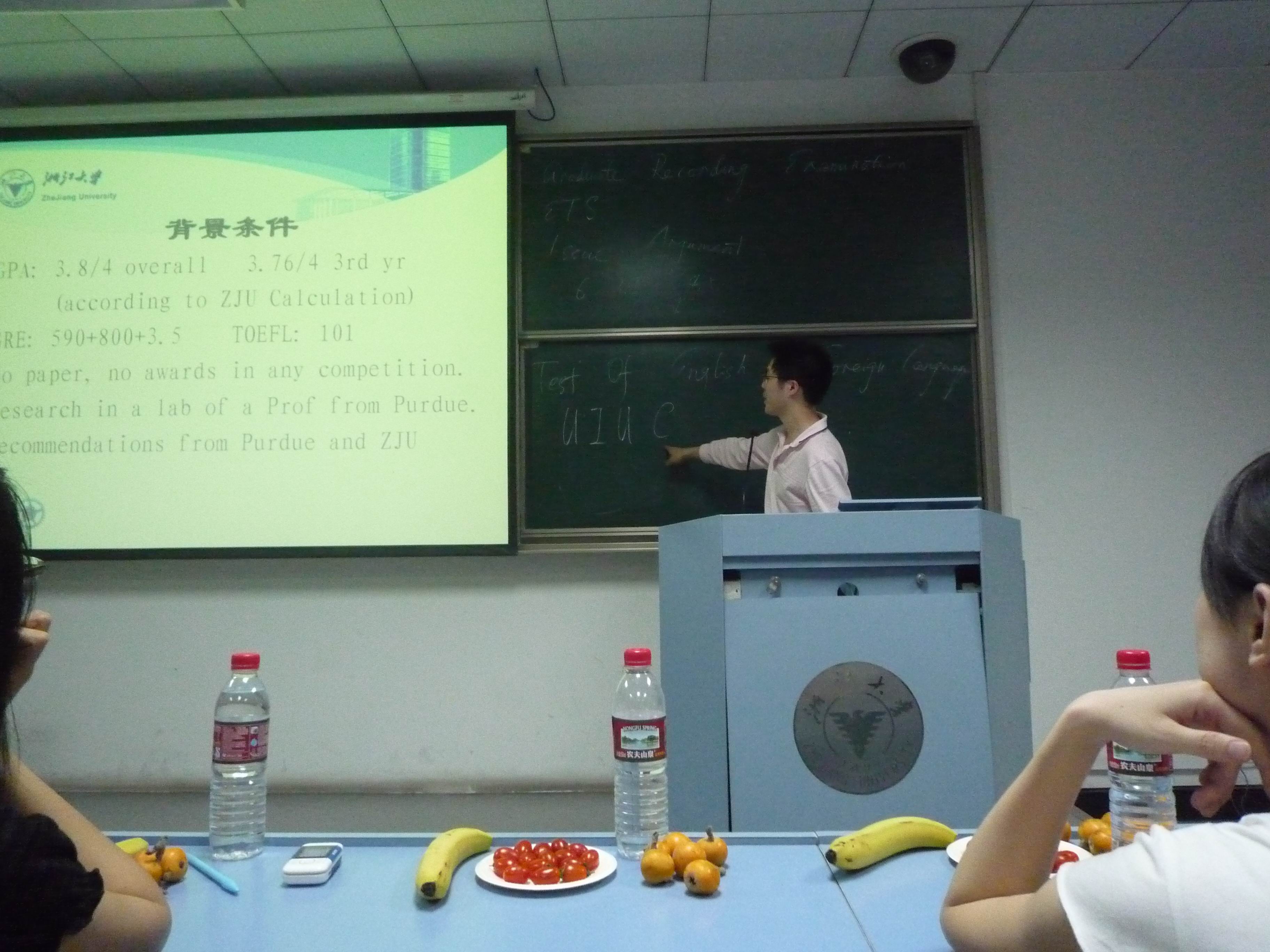 然后是陈毅元学长讲述自己的出国经历。陈毅元学长已经拿到美国普渡大学的OFFER。他从出国的硬件要求出发,到所需的各种软实力,让我们了解到了出国的全过程。同时,学长还介绍了北美对我们浙大友好和对我们机械系友好的大学、优秀的导师以及各个学校的特点,让同学们受益非浅。