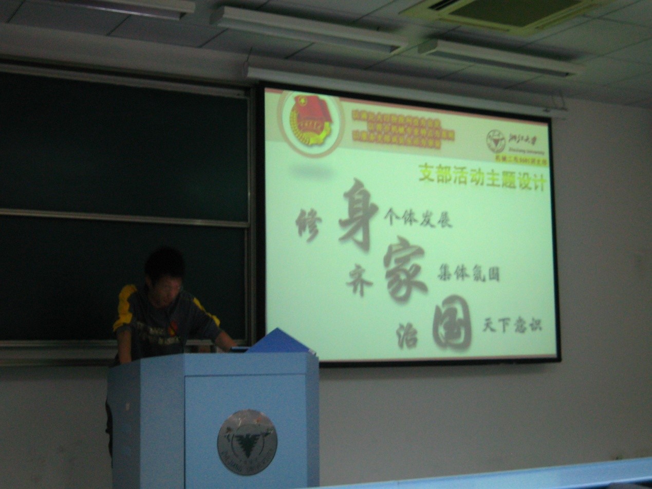 机械工程0601团支部展示内容分为三个部分:争创团队,争创方案以及支部优势。对于此次参与校级答辩支部内高度重视,并提出了“以满足大四阶段利益为出发,以符合机械专业特点为原则,以服务支部成员生活为宗旨”的争创口号。支部争创方案将从继续深化落实各类常规活动和制度建设和结合实际开展特色主题活动两个方面入手。对于前者主要着眼于“五个要”,即:要落实主题活动,要加强信息渠道,要完善团建工作,要促进实践活动,要增强支部凝聚。对于后者要遵循“五个关注”着手,即:关注身心健康,关注贫困同学,关注考研就业,关注学术道德,关注毕业留念。支部预期开展活动将以“修身,齐家,治国”为主题,分别意为关注个人发展,增强集体氛围,引导天下意识三个内容,支部今后活动将主要围绕这三个主题展开。最后,班长黄晖总结了目前支部的开展工作的现状以及有利条件。支部目前各项工作均出色进行,特色鲜明,效果显著:主题活动方面:党员带头,定期活动;常规制度执行方面:按部就班,专人负责学风建设方面:积极参与,成绩斐然支部生活方面:和谐互助,卓有成效。