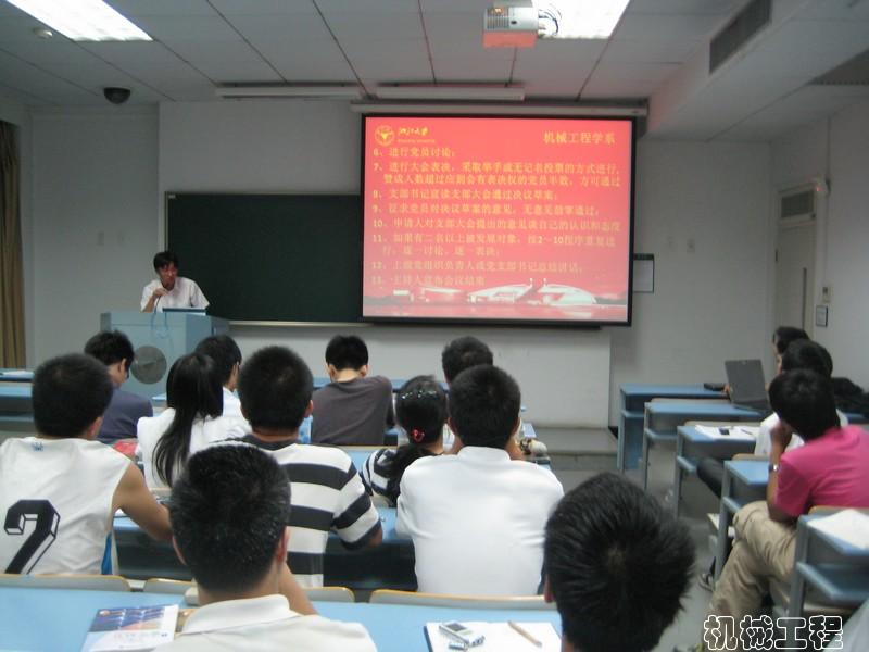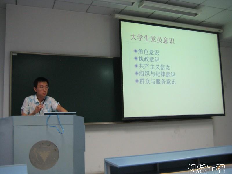 夏日炎炎,但是阻挡不了机械工程学系基层党组织工作的热情,在0607级本科生党支部即将拆分之际,为了更好地健全强化基层党支部的各项工作,2009年6月7日晚,机械工程学系学生党总支在东一A214召开基层党支部工作交流大会,系党委副书记、学生党总支书记郭文刚老师、党总支副书记彭鹤老师,党总支委员徐晓峰同学出席了培训会,并作了相应的培训报告。