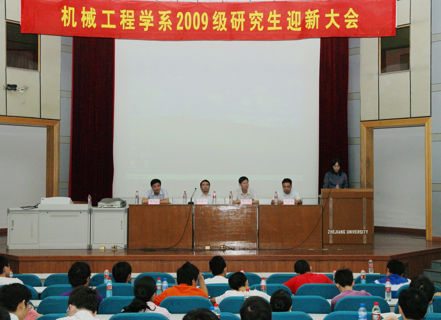 2009年9月11日上午,浙江大学机械工程学系2009级研究生开学典礼暨迎新大会在玉泉校区教七影视厅隆重举行,参加迎新大会的所有同学都被要求隔位就座。机械系领导系主任谭建荣院士、系党委书记李伟教授、系副主任潘晓弘教授、系党委副书记李金林老师、研究生导师代表阮晓东教授等出席迎新大会。迎新大会由系党委副书记李金林老师主持。