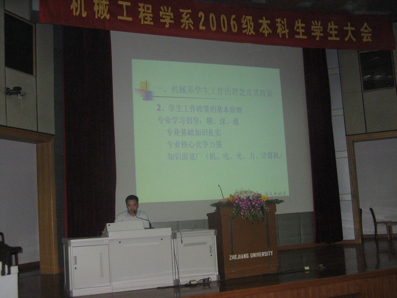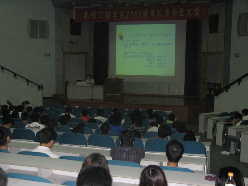 有人说过,大学是一个人择业的过程,在这个过程中,我们需要成熟起来,今天,在这个过程到达最关键的时刻,机械工程学系于9月23日晚在玉泉校区教七影视厅召开2006级本科生年级大会。系党委副书记李金林老师主持了本次会议并对06级同学进行了辅导。 首先,李金林老师介绍了机械系学生工作的理念及政策。机械系培养的学生不仅应在专业上做到精深通,更应在素质素养上做到优秀。然后,李老师就保研、考研、就业方面对06级同学进行了深入讲解,并讲述了自己的经历。保研,给了自己一个提升的机会,要珍惜;考研,给自己一个证明自己的机会,要抓住;工作,是一个验证自己的过程,要坚持和完善。保研,考研,就业,人生的成功,其实关键在于你的人生规划和选择。机会对于每个人都是平等的,关键在于意识机遇的能力、抓住机遇的能力和利用机遇的能力。无论接下来选择什么,我们都要never give up。 李老师讲解了他对人生规划的见解。他说:人生最重的事,不是你现在站在何处,而是你今后要朝那个方向,只要方向对,找到路,就不怕路远,方向比速度更重要。要朝着自己的目标努力,不要对自己的选择后悔,无论你选择什么,爱惜自己,坚持方向,必会胜利。失败,不重要,关键在于是否能从失败中吸取教训,我们应学会感恩,对失败感恩。以一颗感恩的心,在逆境中寻求希望,在悲观中寻求快乐。