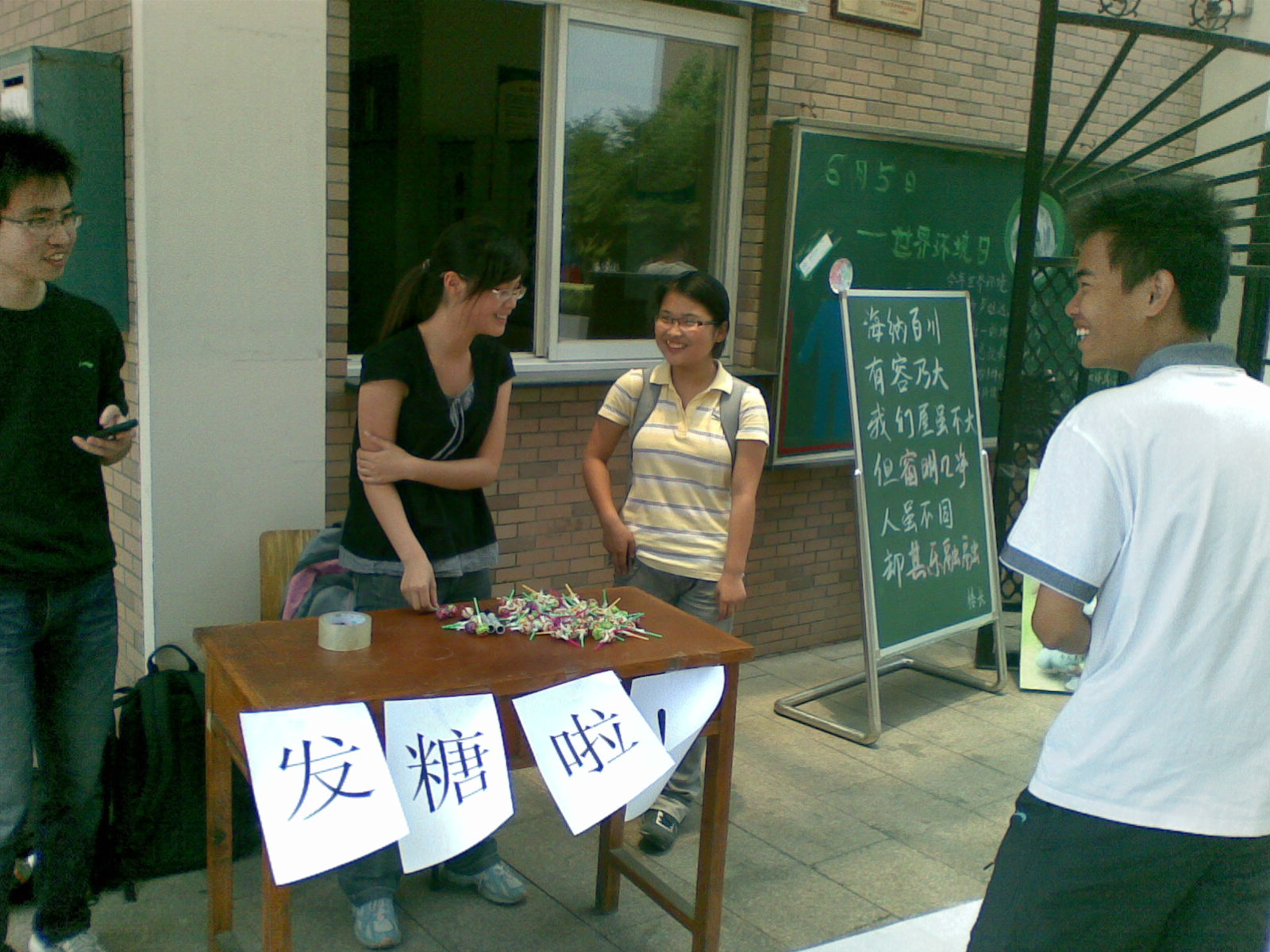 六一当天中午11点,学生会分为两队,分别在蓝田学园和碧峰学园门口展开活动。路过的同学只要在准备好的横幅上签名或是写上任何想写的东西,便可免费获赠一根棒棒糖。