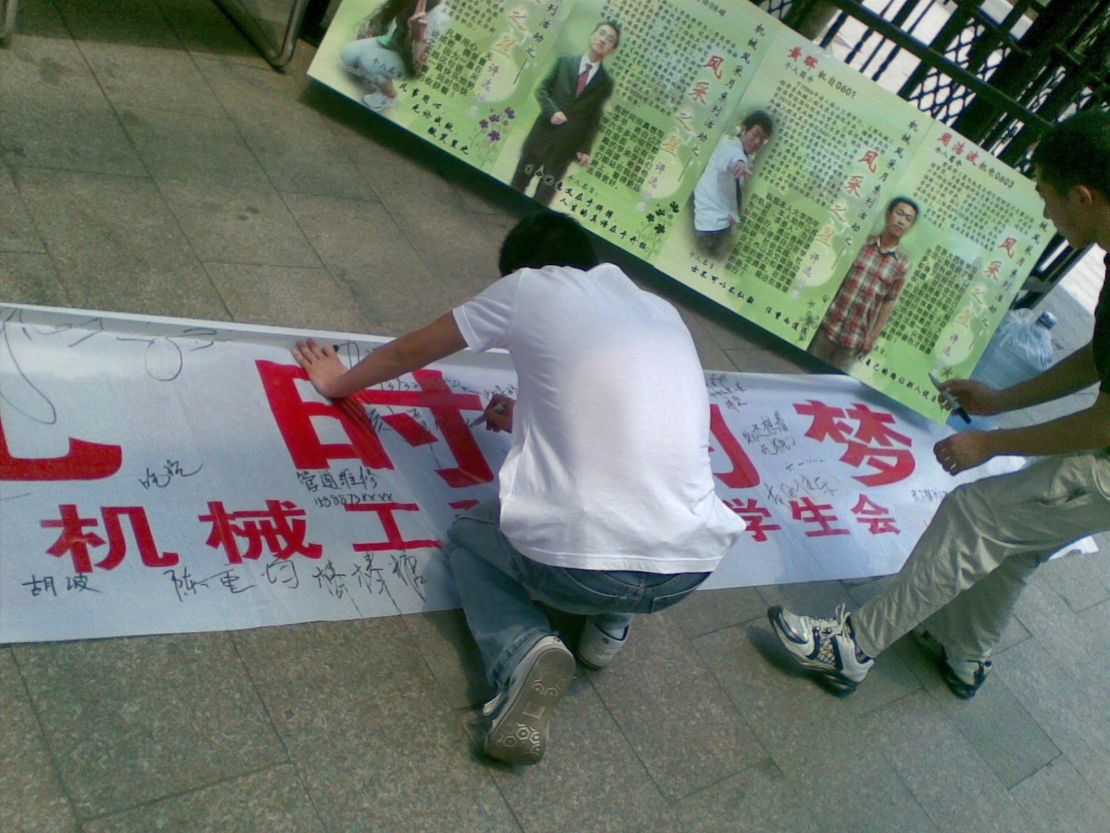 不一会便吸引了很多同学驻足观看,更有不少同学亲自动手在横幅上写字。“棉花糖”、“小王子”、“小飞猪”等一些稚气未脱的名词纷纷出现,诸如“管道维修:158***”、“开锁:137***”、“婚介:150***”等恶搞的另类“广告”也层出不穷,同学们又找到了童年一般的天真与快乐。