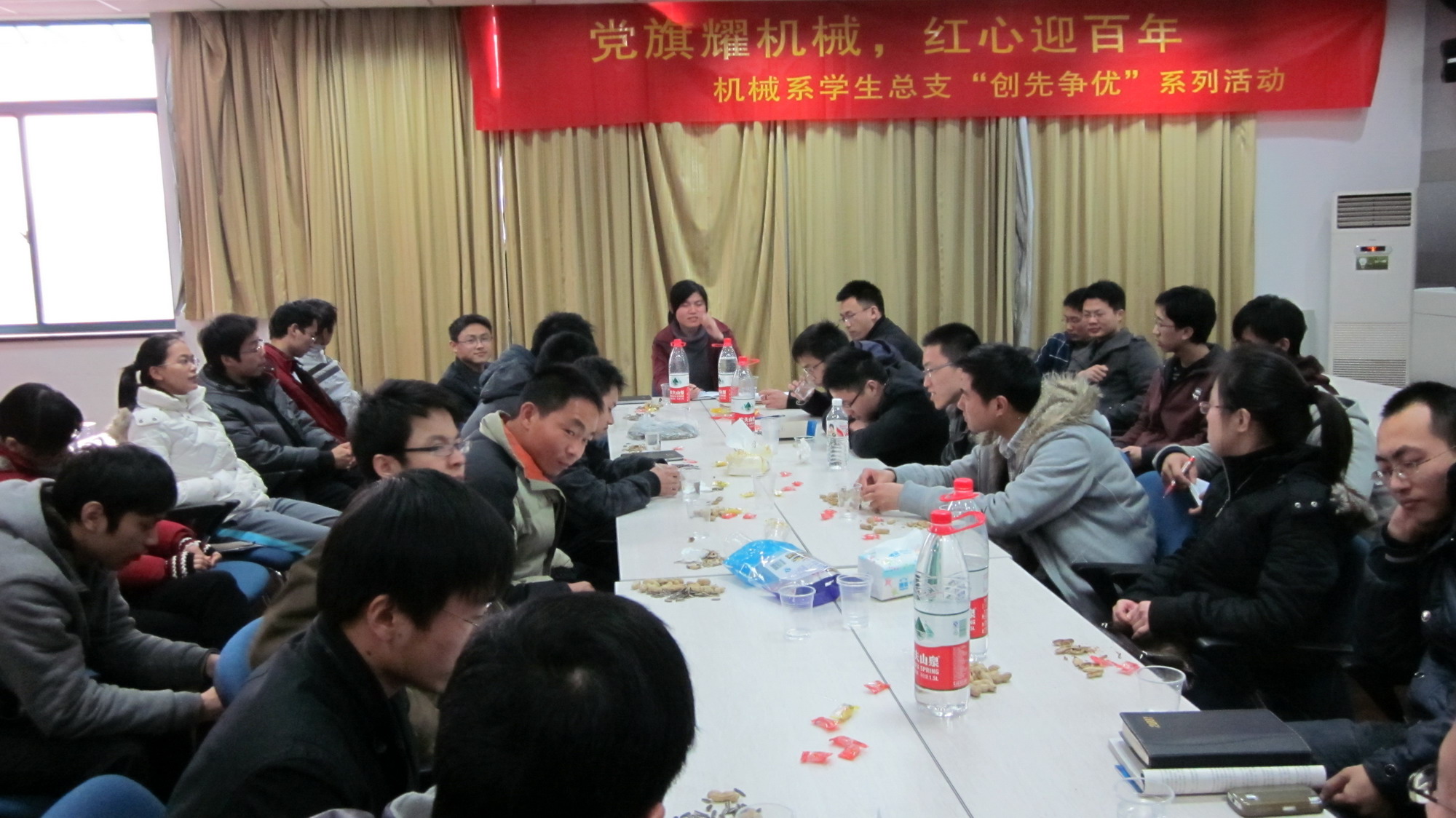 2011年3月5日,学习雷锋纪念日,同时也是周总理诞辰113周年纪念日。在这样一个特殊的日子里,机制09硕一班党支部与机制博一班党支部于玉泉校区第三教学大楼406室开展了座谈交流会活动,此次座谈会是承接机械系学生党总支主题之“党旗耀机械,红心迎百年”的一次创先争优活动,座谈会由机制硕一班支部副书记章婷主持,硕一班和博一班所有成员均准时参加了本次活动。