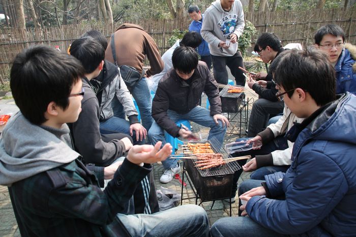 11:30,我们赏过了梅花,顺道到了桃花园。我们进行第二个活动——烧烤。扑过桌布,点起炭火,大家就围在一起烤了起来。大家娴熟地用刷子刷着各种酱,撒着粉,颇有几分家庭主妇的模样。其中由颜晓辉、刘军、陈志法几个组成的“党员小组”,他们烤的东西既好看又好吃。大家围在一起吃着、聊着、笑着,其乐融融,我们就是一个幸福的大家庭。