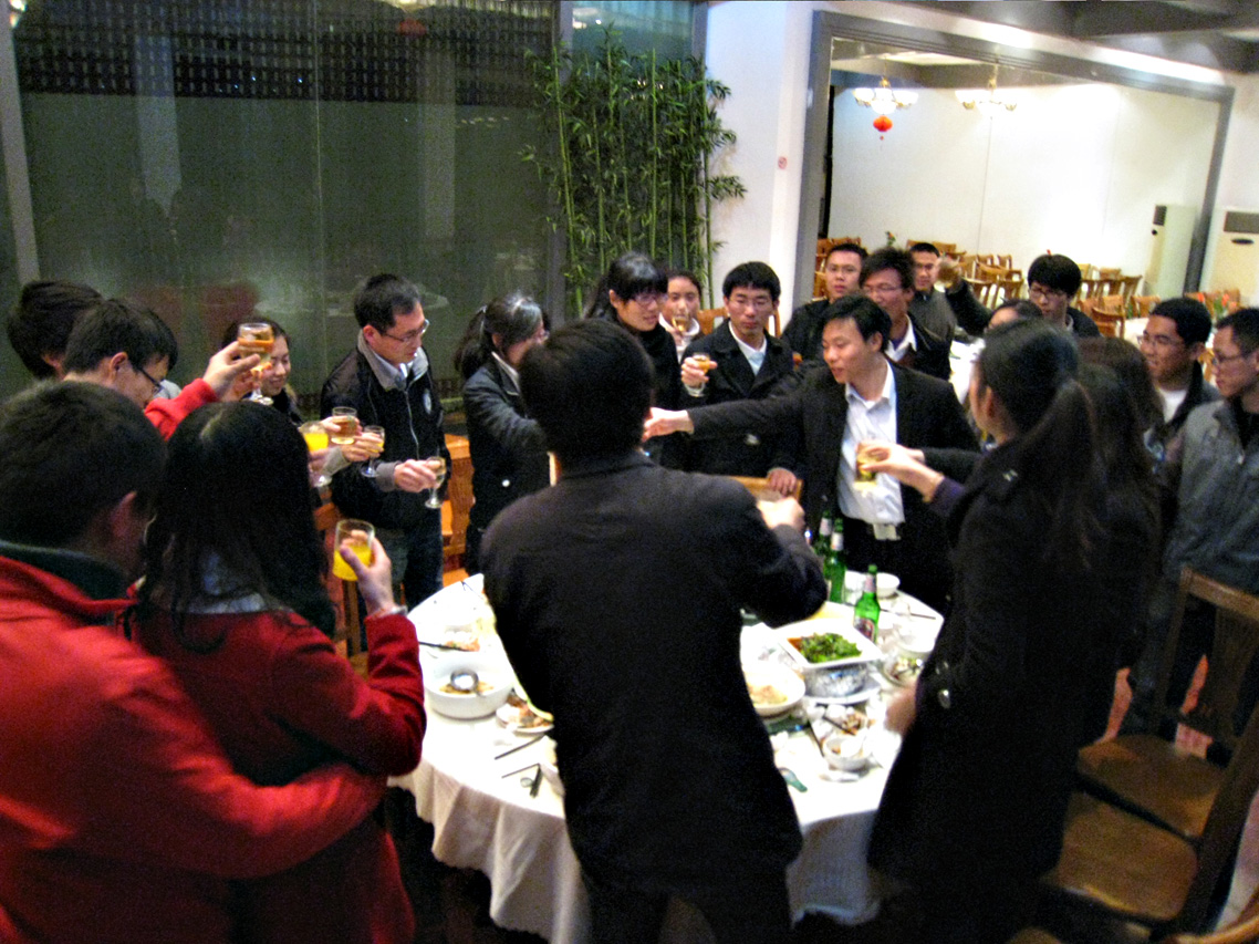 觥筹交错间,气氛更加的开放,由我们这些师弟师妹们轮流向研三的师兄师姐们敬酒,送祝福话离别,或在一起拍照留念,或请教一些学业和生活上的困惑。