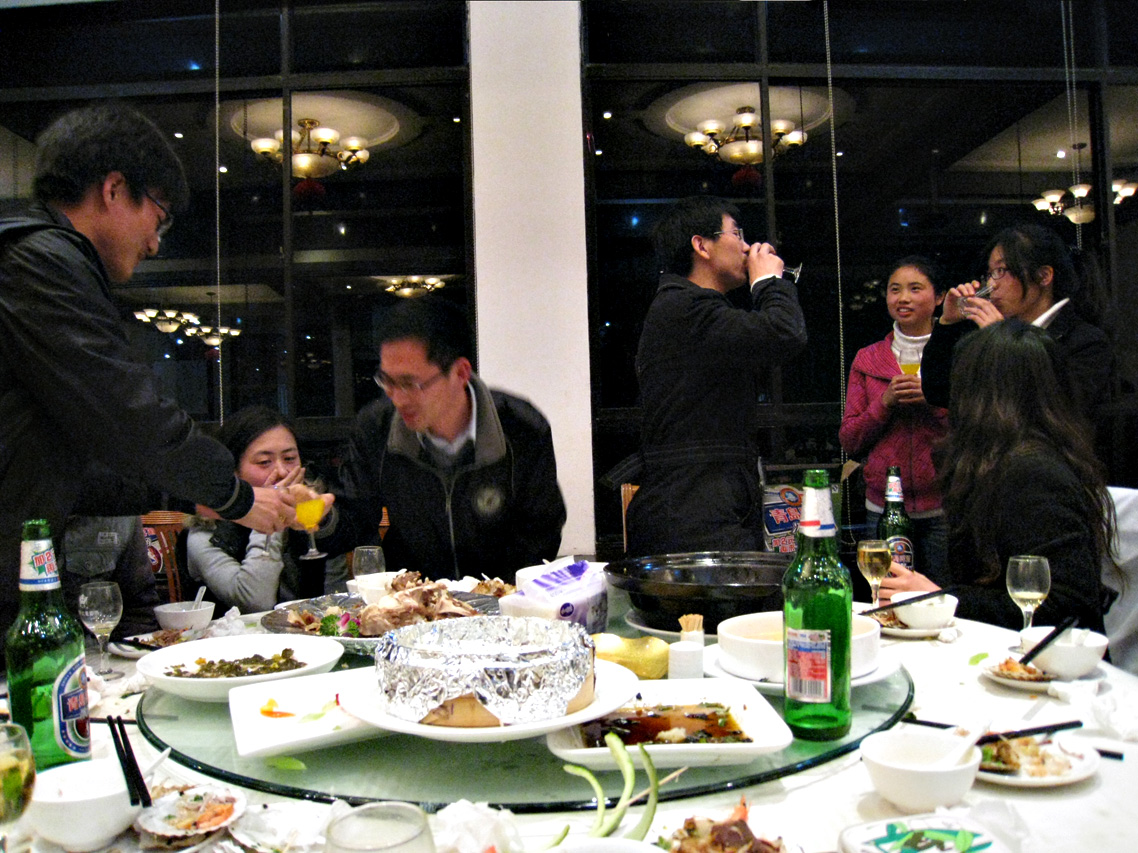 开席后,先是研三的师兄师姐们向每一位老师敬酒,然后是研二研一的向老师们敬酒。