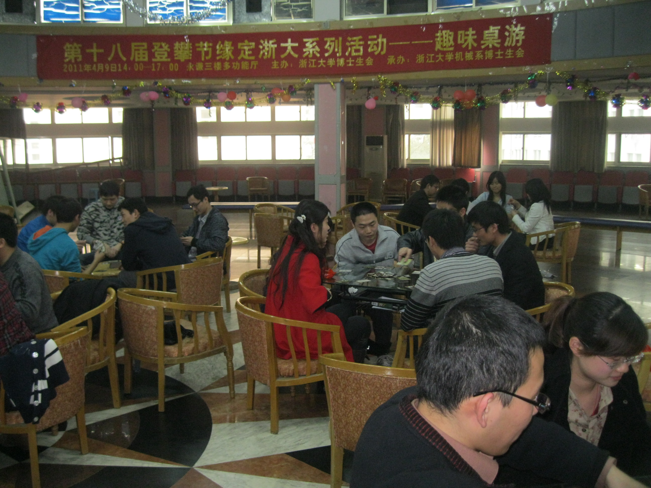 2011年4月9日下午,由浙江大学博士生会主办、机械系博士生会承办的第十八届“登攀节”缘定浙大系列活动之“趣味桌游”在玉泉永谦三楼多功能厅顺利举行。全校各院系以及各实验室的广大研究生踊跃参加,积极交流,场面热烈,收到了良好的效果。