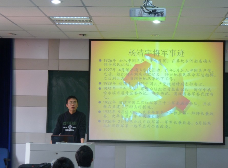 看完电影之后,各个支部的同志为大家带来了“双百人物”的讲解。“双百人物”即是“100位为新中国成立作出突出贡献的英雄模范人物”和“100位新中国成立以来感动中国人物”。讲台上,同志们为我们带来了杨靖宇将军、李兆麟同志、邹韬奋同志、李四光同志、张学良将军、张玉泉同志的先进事迹和感人精神。这里面,既有奋勇杀敌的将军,也有摇动笔杆的新闻工作者,既有已英勇牺牲的先烈,也有仍坚守岗位的公仆,既有信仰坚定的我党同志,也有为国奋起的他党人氏。但不管他们来自哪里,信仰什么。他们的心中,想的是人民,他们的胸怀,装的是国家。人物事迹介绍完以后,各个支部的同志进行了讨论。通过讨论,各位同志更加坚定了自己的信念,更加坚定了自己为同学服务的精神,同时也更加注重培养自己坚强不屈的精神。