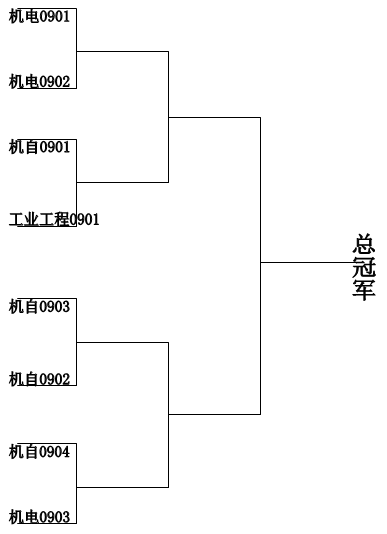 2011年3月底4月初,系学生会举行了“机情”杯机械系篮球争霸赛。经过两个周末的较量,机自0902班一路过关斩将赢得了冠军。此次比赛计划09届共8个班参加,全部到场战斗,因为队伍不多,直接进行淘汰赛。