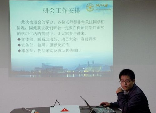 之后,研会事务部的靳兴来同学对机械系系研究生的参赛情况做了详细的说明。他在发言中高度肯定了本次运动会中推出的“一对一服务”方式,此方式确保了运动员的相关物资发放以及检录等事项的顺利进行,因此,他建议在日后的校运会组织工作中应继续采用这种方式,为运动员提供坚实的后勤保障。
