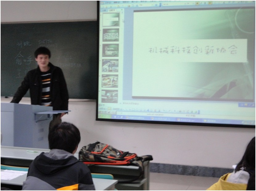 机械科技创新协会社员大会于2011年11月27日下午3点30在西一309教室顺利召开。全体社团成员均参与此次大会。本次社员大会主题为:“总结过去,展望未来;加强沟通,促进交流”,主要分为社团介绍、部长讲话、部门展示、社长寄语四部分。