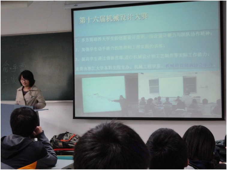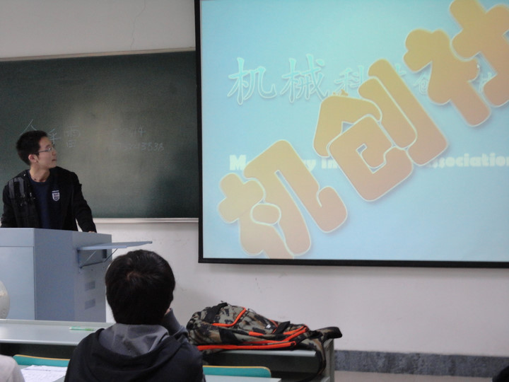 三点半左右,会议正式开始。由机械科技创新协会社长王雯吉同学、副社长俞呼雷同学、办公组刘统同学向全体社员介绍社团构架、理念,做工作回顾及展望。在他们详尽的介绍中,社员们对社团有了更加详细的了解,并对今后的工作方向有了清晰的认知。之后,办公组组长应义星同学给大家介绍社团构架新增部门“办公组”,他说道:“办公组不是一个‘普通部门’,也不是一个‘文艺部门’,当然,更不是一个‘二逼部门’,它是一个监理部门。它的主要职责是协调三个基础部门之间的工作。”揭开了办公组神秘的面纱。第一个环节到此结束。